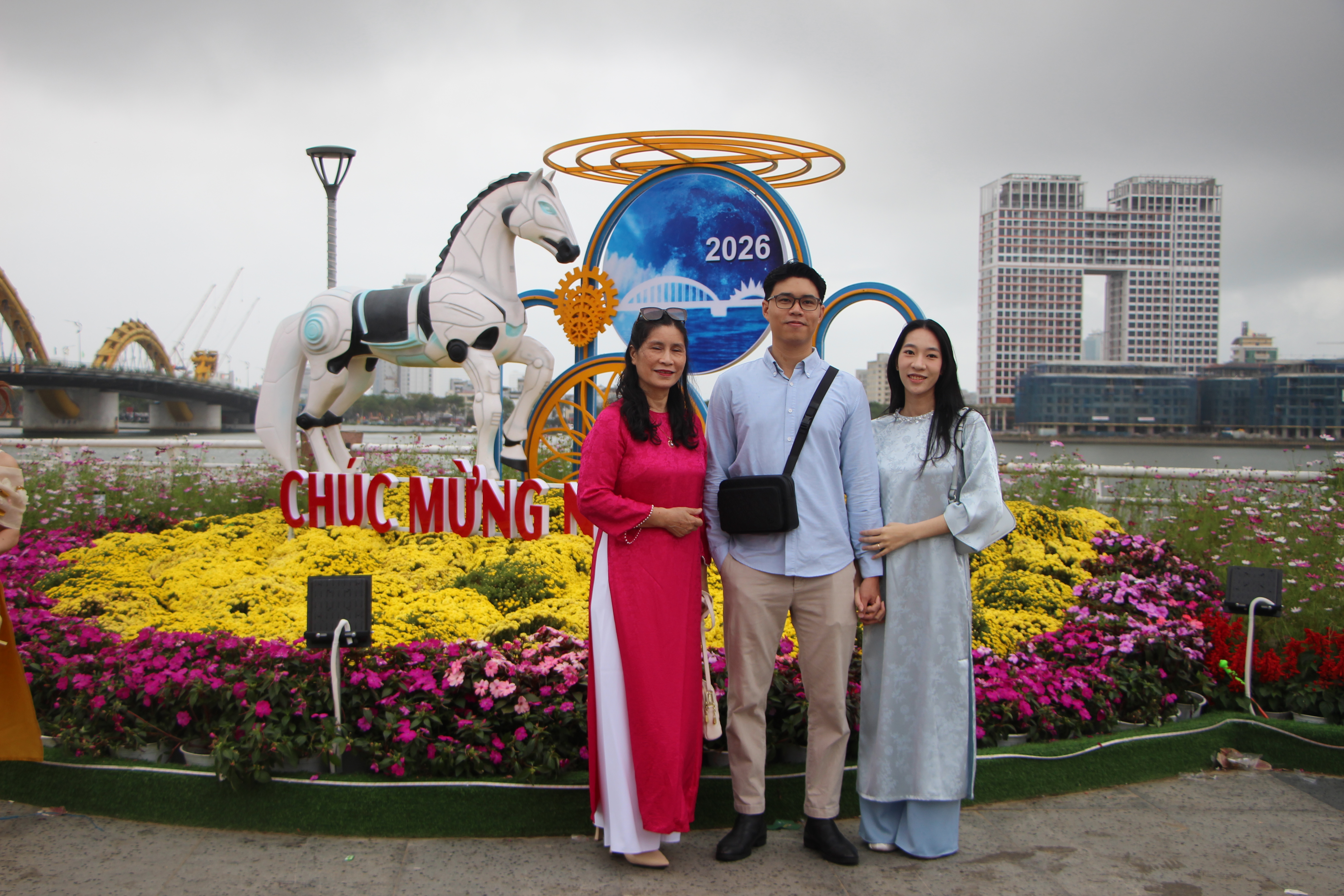 Những ngày giáp Tết Nguyên đán Bính Ngọ 2026, nhiều bạn trẻ cùng du khách diện áo dài duyên dáng, thướt tha check-in tại các đường hoa của TP Đà Nẵng.