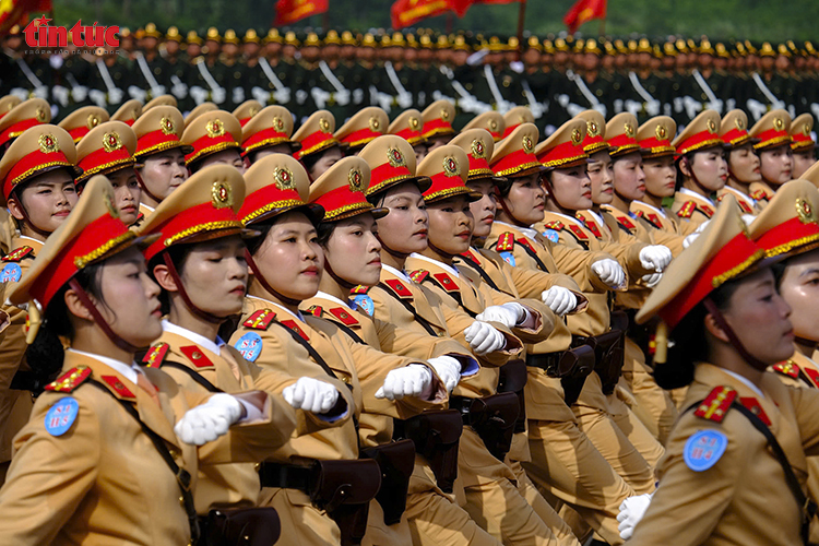 Đội hình nữ sĩ cảnh sát giao thông thể hiện bước đi khỏe khoắn, đều tăm tắp.