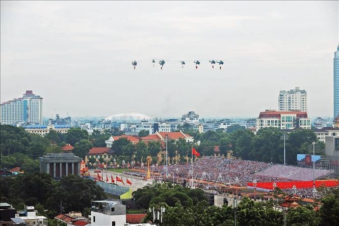 Biên đội máy bay trực thăng của Không quân nhân dân mang theo cờ Đảng, cờ Tổ quốc bay trên bầu trời Hà Nội.