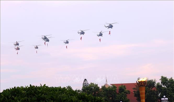 Màn trình diễn của biên đội máy bay trực thăng Mi-171, Mi-17, Mi-8 mang theo cờ Đảng, cờ Tổ quốc bay qua khu vực Quảng trường Ba Đình.