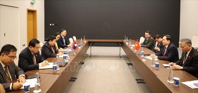 Nhân dịp tham dự Đại hội đồng Liên minh Nghị viện Thế giới (IPU) lần thứ 146, tổ chức tại thủ đô Manama của Bahrain, Phó Chủ tịch Thường trực Quốc hội Trần Thanh Mẫn tiếp Phó Chủ tịch Quốc hội Lào Sounthone Xayachak (12/3/2023).