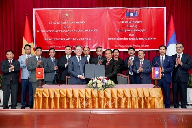 Lễ ký kết Biên bản ghi nhớ hợp tác giữa Trung ương Hội Nông dân Việt Nam và Trung ương Mặt trận Lào xây dựng đất nước (Vientiane, 5/3/2024).
