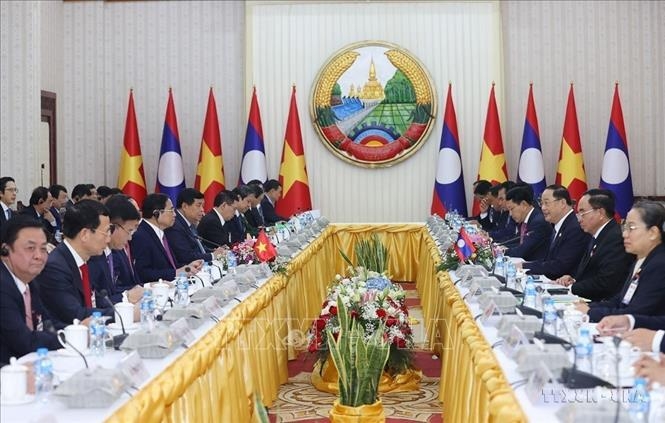 Thủ tướng Phạm Minh Chính hội đàm với Thủ tướng Lào Sonexay Siphandone trong chuyến thăm chính thức Lào, sáng 11/1/2023, tại thủ đô Vientiane.