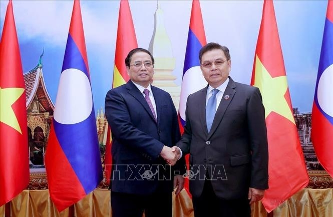 Thủ tướng Phạm Minh Chính hội kiến Chủ tịch Quốc hội Lào Saysomphone Phomvihan trong chuyến thăm chính thức Lào, chiều 11/1/2023, tại thủ đô Vientiane.