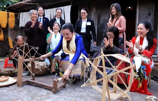 Phu nhân hai Thủ tướng Việt Nam và Lào trải nghiệm việc dệt đũi tại làng nghề dệt đũi Nam Cao (xã Nam Cao, huyện Kiến Xương, tỉnh Thái Bình), ngày 6/1/2024.