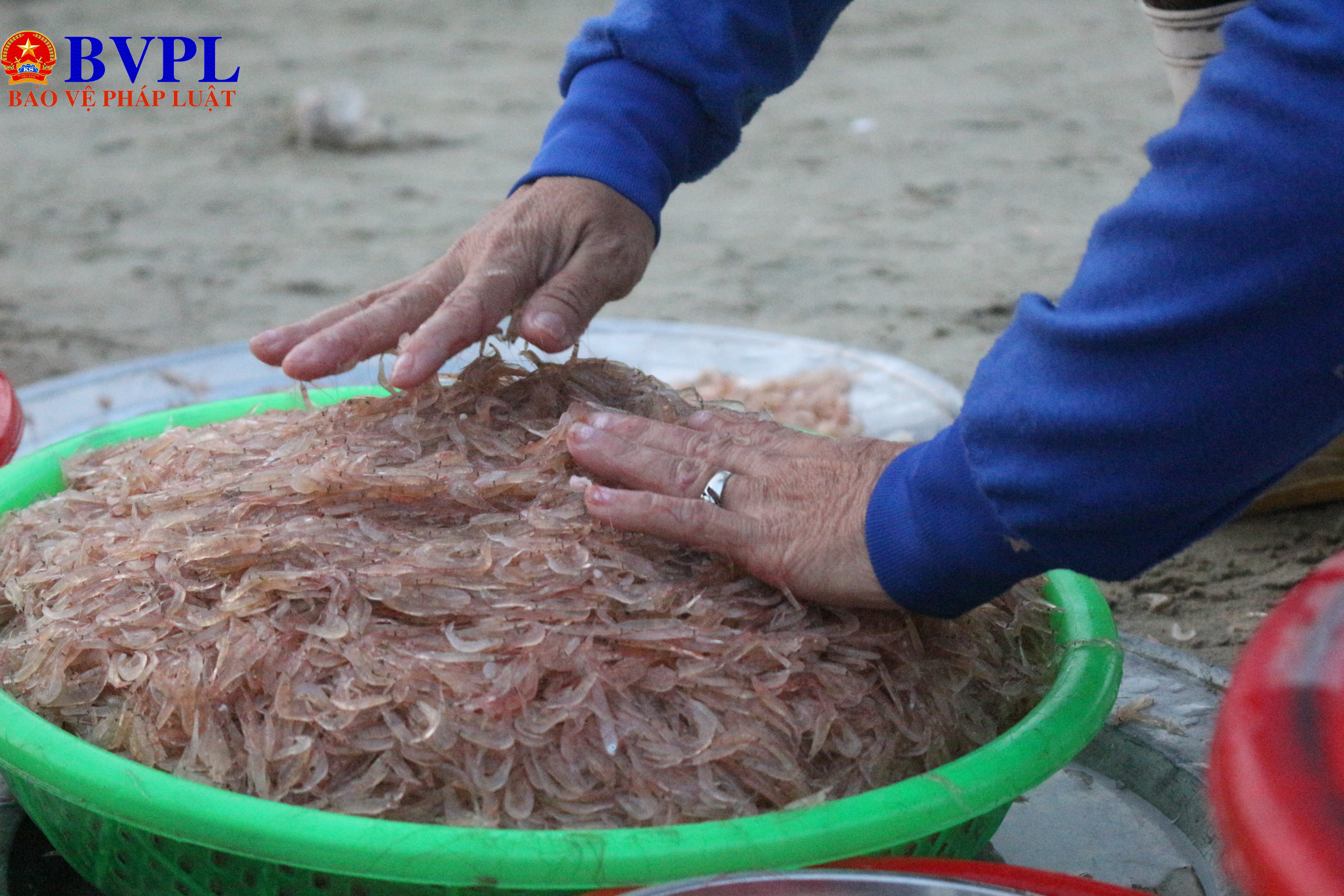 Những chiếc thúng chở theo những sọt lớn ruốc biển đỏ au, tươi rói.(ảnh: LT)