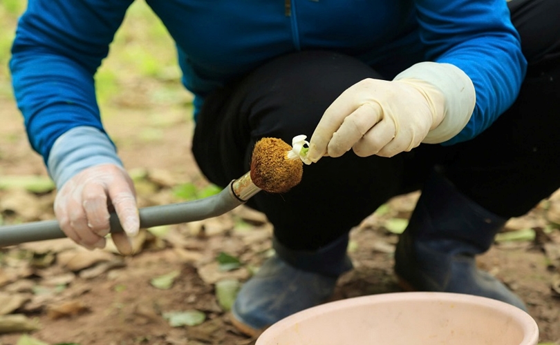 Người làm vườn dùng chổi lông để lấy phấn, khi chổi lông đã phủ đầy phấn hoa, họ bắt đầu thụ phấn trực tiếp cho các nụ hoa.