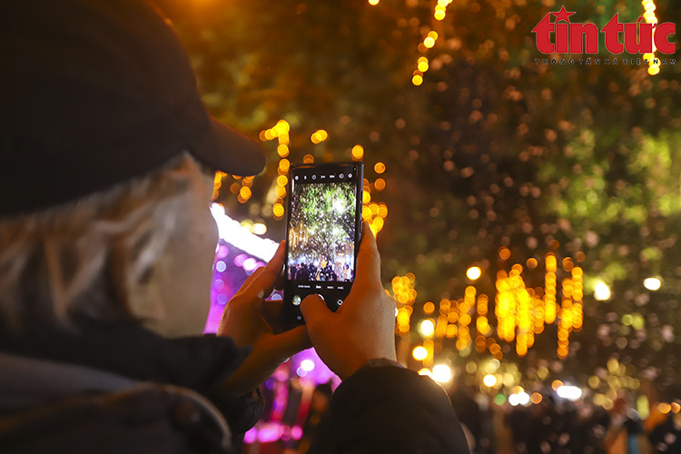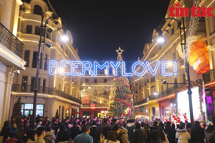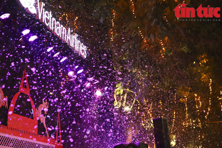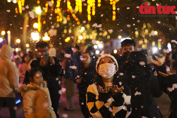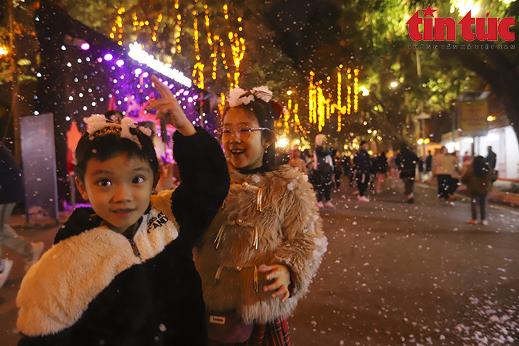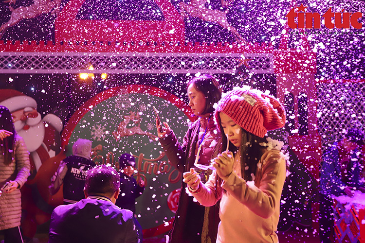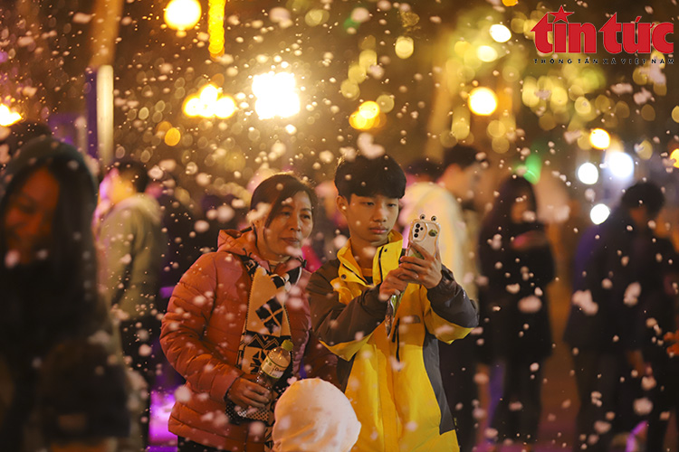 Đêm 24/12, trên phố đi bộ Trần Nhân Tông (quận Hai Bà Trưng, TP Hà Nội) rất đông người đã tới tham quan, ngắm "tuyết rơi" trắng xóa trong đêm Noel.