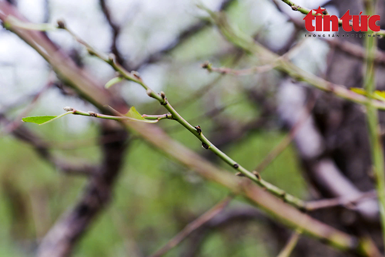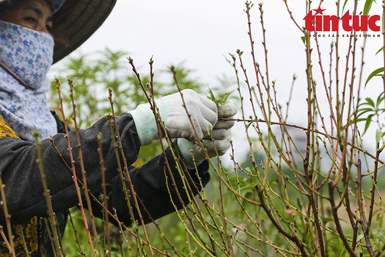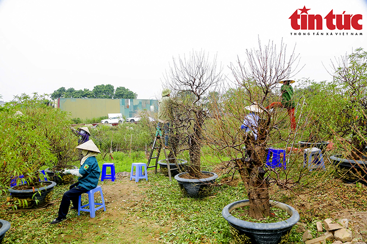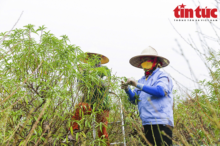 Những ngày này, người dân làng Nhật Tân (Hà Nội) đang tất bật tuốt lá đào, để cây ra hoa đúng dịp Tết Ất Tỵ 2025.