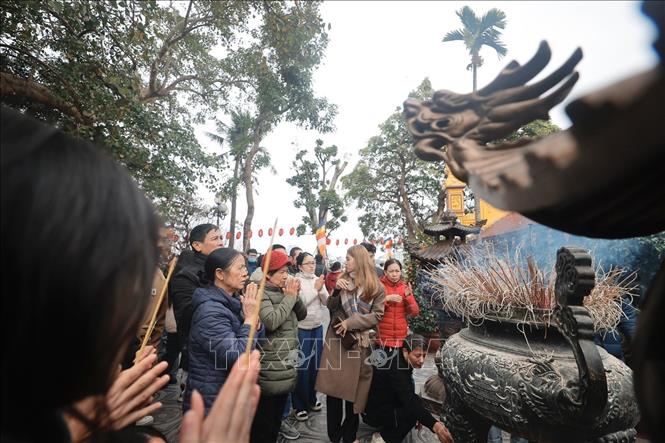 Dù còn 3 ngày nữa mới đến Rằm tháng Giêng, nhưng hôm nay 9/2 (tức ngày 12 tháng Giêng năm Ất Tỵ) là ngày nghỉ cuối tuần, nhiều người dân Thủ đô Hà Nội và du khách thập phương đã đến chùa để làm lễ.