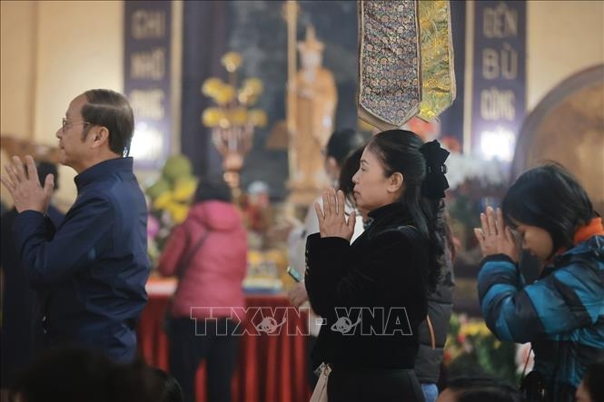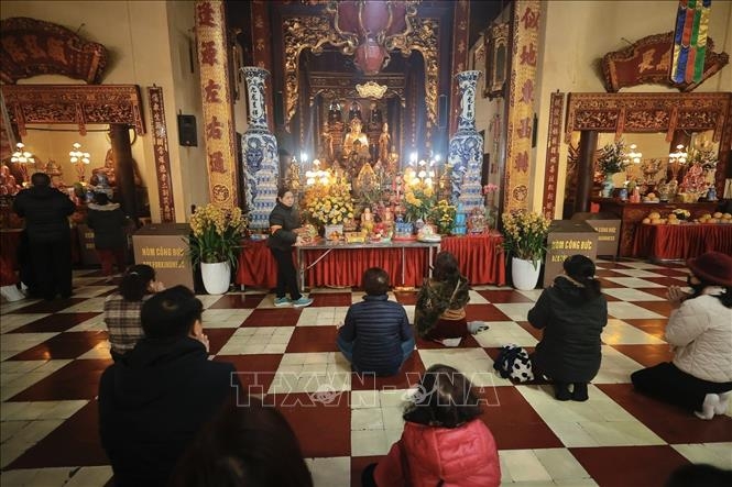 Người dân đi lễ Rằm tại chùa Quán Sứ.