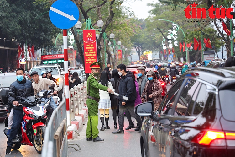 Lượng người đi lê chùa Trấn Quốc đông khiến trên đường Thanh Niên, các phương tiện di chuyển khó khăn.