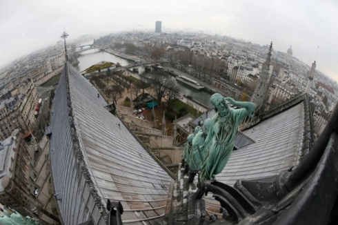 Một bức tượng của Eugène Viollet le Duc - một kiến trúc sư và một người tu sửa Nhà thờ Đức Bà thế kỷ 19. Trong ảnh là phần mái của Nhà thờ khi nhìn từ trên cao.
