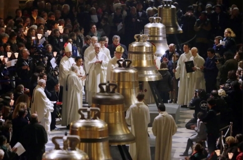 Mọi người tham gia lễ khánh thành những quả chuông mới ở Nhà thờ Đức Bà ngày 2/2/2013. Những quả chuông này nặng 23 tấn và được sử dụng để thay thế cho những quả chuông từng bị phá hủy từ thời Cách mạng Pháp cuối thế kỷ 18.