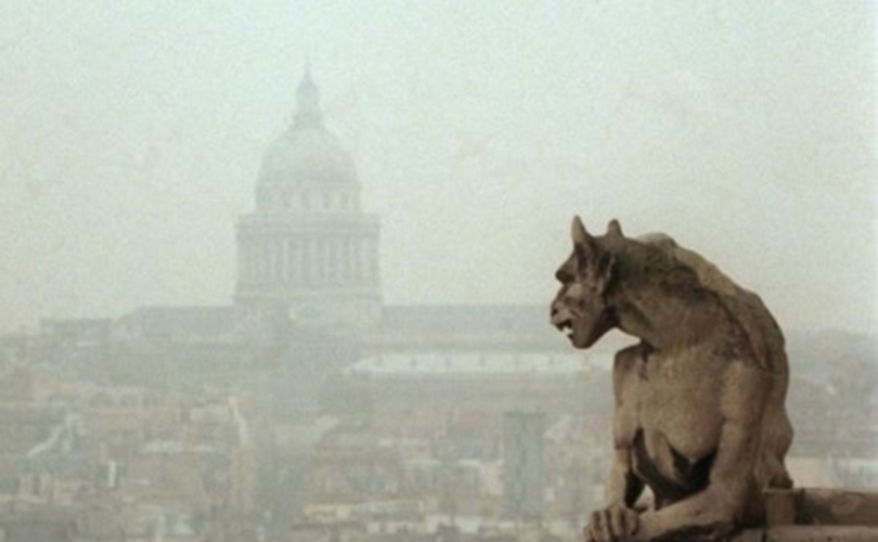 Một máng xối nước mặt quỷ nhìn bao quát Paris từ đỉnh Nhà thờ Đức Bà ngày 10/1/1997. Công trình này và các máng xối nước của nó là một trong những đặc điểm tiêu biểu của Paris thời trung cổ.