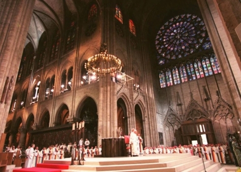 Các mục sư và những tín đồ tập trung trước Nhà thờ Đức Bà để dự lễ ban thánh thể ngày 11/2/2008. Nhà thờ Đức Bà mang nhiều giá trị không chỉ về mặt lịch sử, tôn giáo mà còn cả kiến trúc và nghệ thuật.