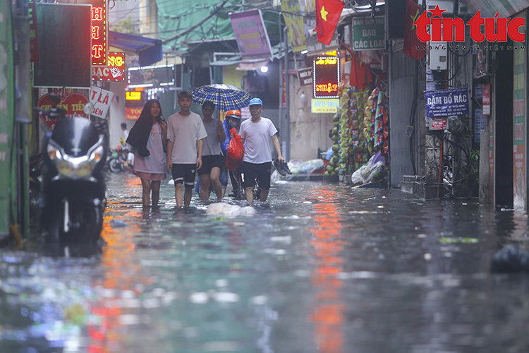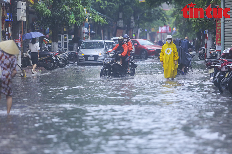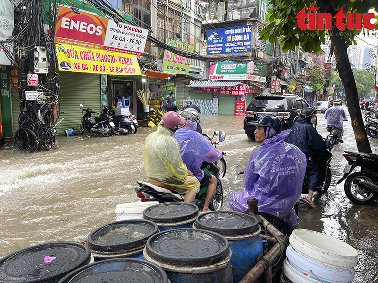 Ghi nhận của phóng viên báo Tin tức, gần 12 giờ, trận mưa lớn xối xả đã khiến nhiều tuyến phố khu vực quận Thanh Xuân như Vương Thừa Vũ, Láng, Tô Vĩnh Diện, Khương Trung, Bùi Xương Trạch... chìm trong "biển nước".