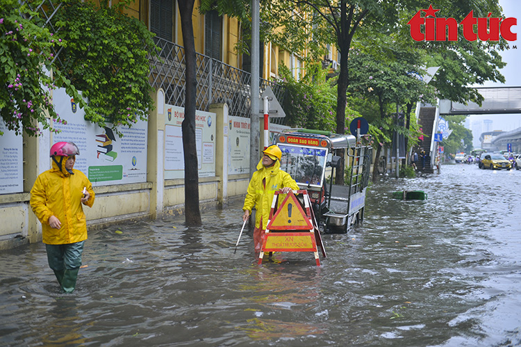 Nhân viên Công ty Thoát nước chốt trực trên một số tuyến phố ngập nước để hướng dẫn giao thông và khơi thông miệng hố ga để nước mưa rút nhanh hơn.
