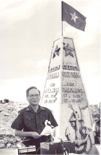 Đại tướng Lê Đức Anh - Bộ trưởng Quốc phòng đọc lời thề bảo vệ biển đảo của Tổ quốc trong lễ kỷ niệm 24 năm ngày truyền thống Quân chủng Hải quân tại đảo Trường Sa Lớn, ngày 7/5/1988