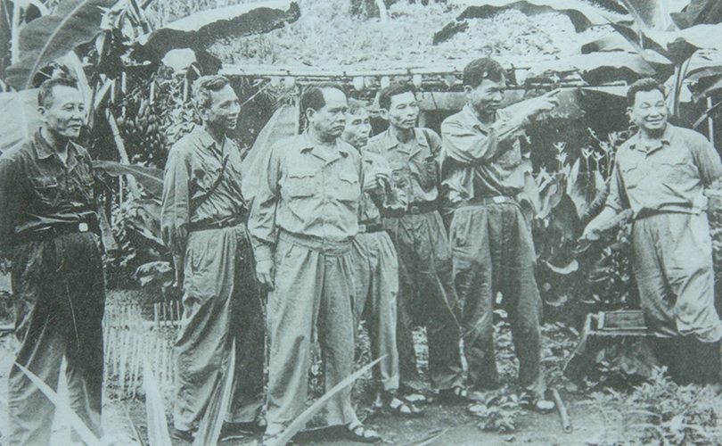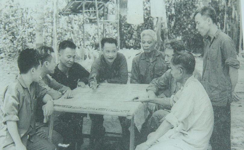 Phó Tư lệnh - Tham mưu trưởng Quân giải phóng miền Nam Lê Đức Anh (người đang giơ tay chỉ) và Phó Chính uỷ miền Lê Văn Tưởng (ngoài cùng bên trái) cùng các đồng chí trong Bộ Tư lệnh miền tại căn cứ Tà Thiết, năm 1971