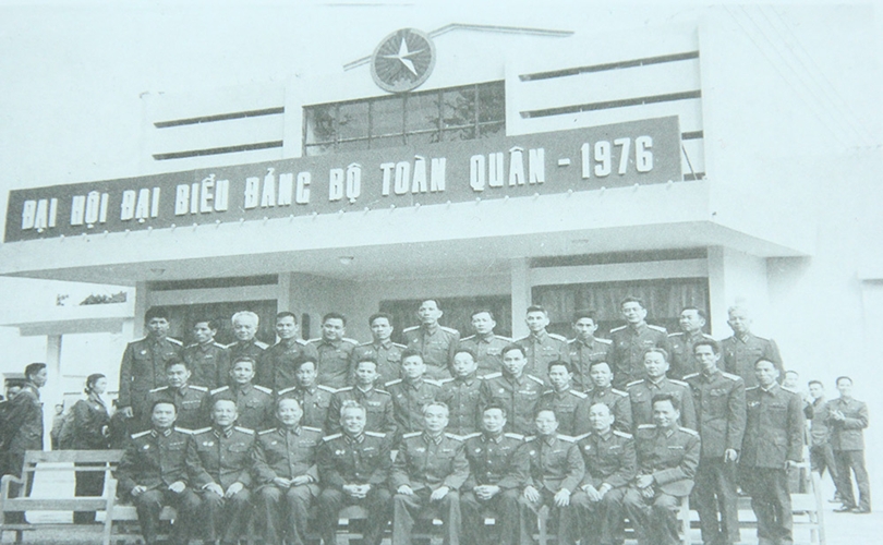 Trung tướng Lê Đức Anh - Tư lệnh Quân khu 9 (ngồi ghế ngoài cùng bên phải) chụp ảnh cùng với Đại tướng Võ Nguyên Giáp, Đại tướng Văn Tiến Dũng và một số đại biểu dự Đại hội đại biểu Đảng bộ quân đội lần thứ 2 tại Hà Nội, năm 1976