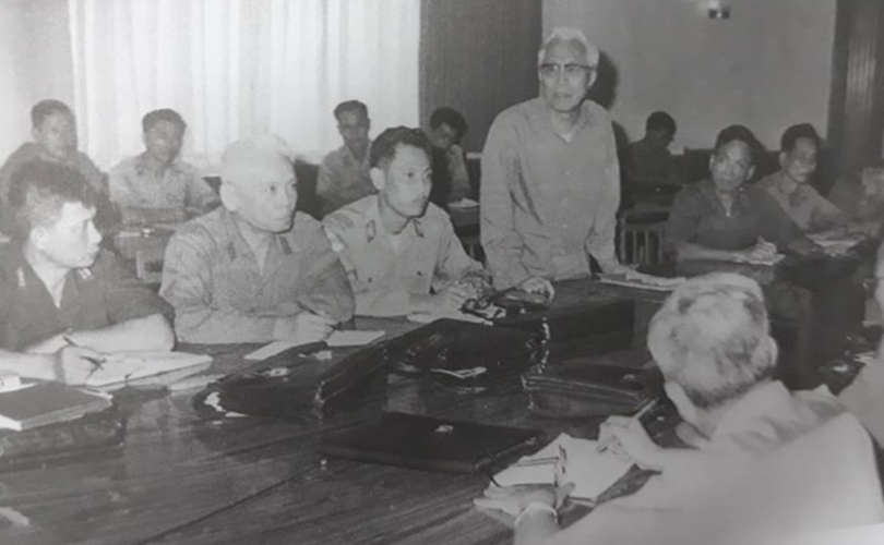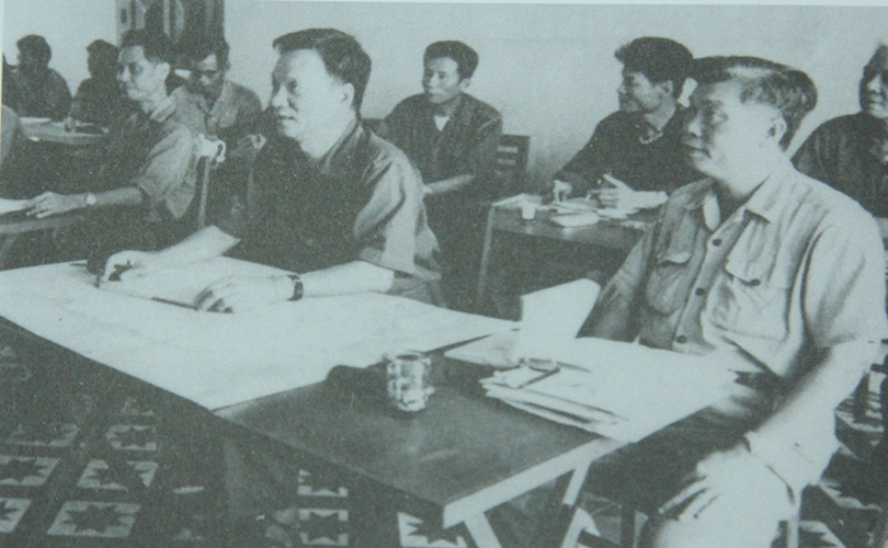 Thượng tướng Lê Đức Anh - Thứ trưởng Bộ Quốc phòng, Trưởng ban lãnh đạo đoàn chuyên gia kiêm Tư lệnh quân tình nguyện Việt Nam tại Campuchia nghe báo cáo tình hình chiến sự và công tác giúp bạn hồi sinh đất nước tại Sở chỉ huy lãnh đạo đoàn chuyên gia ở Phnom Penh, Campuchia, tháng 3/1980
