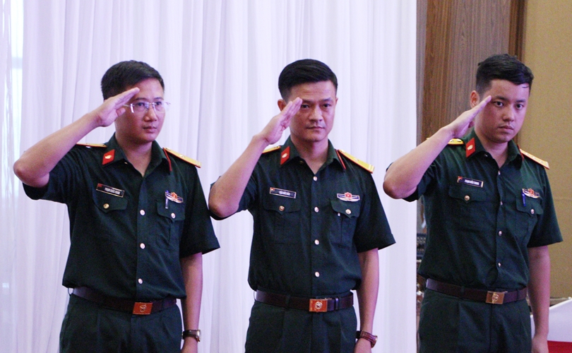 Đội VKS quân sự Quân khu 4 thực hiện động tác chào trước khi trình bày bài thuyết trình.