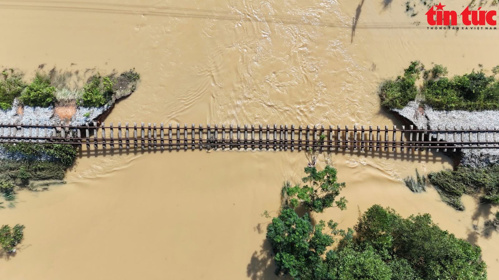 Đoạn đường sắt chạy qua xã Trung Giã bị nước cuốn trôi nền đất, đá dài khoảng 20m.