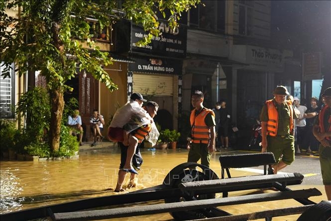 Lực lượng công an thành phố Yên Bái giúp người dân phường Hồng Hà di chuyển ra khỏi khu vực ngập úng trong đêm 8/9.