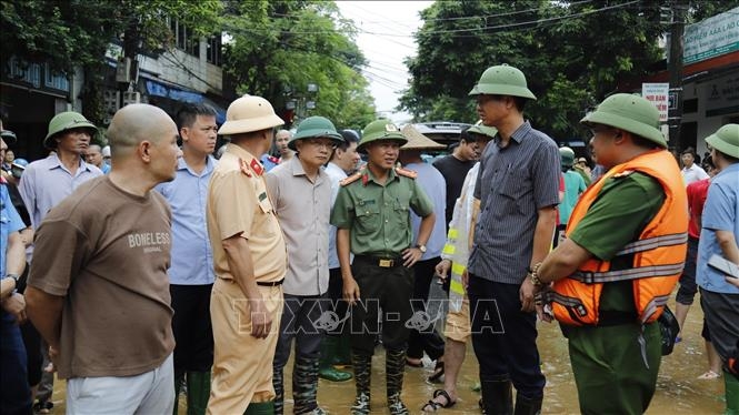 Ông Nguyễn Thế Phước, Phó Chủ tịch UBND tỉnh Yên Bái (thứ 2, bên phải) cùng lãnh đạo thành phố kiểm tra, chỉ đạo ứng phó và khắc phục hậu quả thiên tai tại thành phố Yên Bái.
