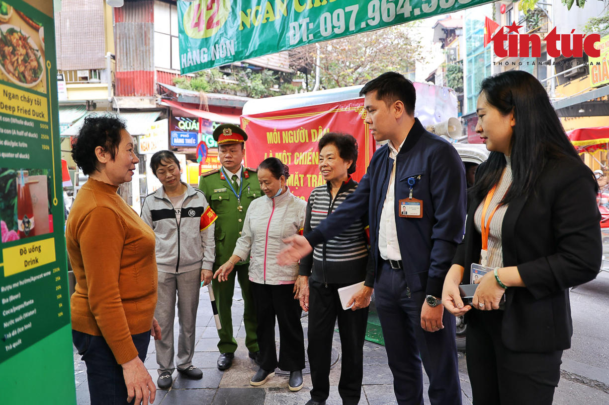 Tổ công tác của phường Hàng Gai, quận Hoàn Kiếm, Hà Nội tuyên truyền, vận động các cửa hàng kinh doanh bảo đảm vệ sinh môi trường, an toàn thực phẩm.