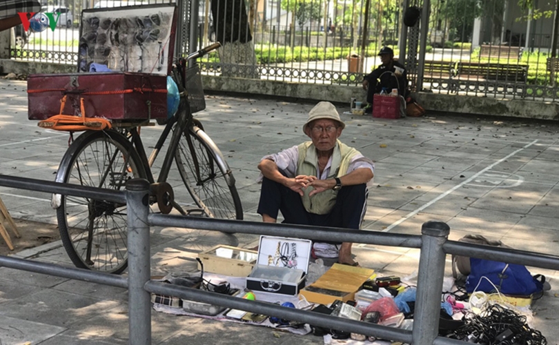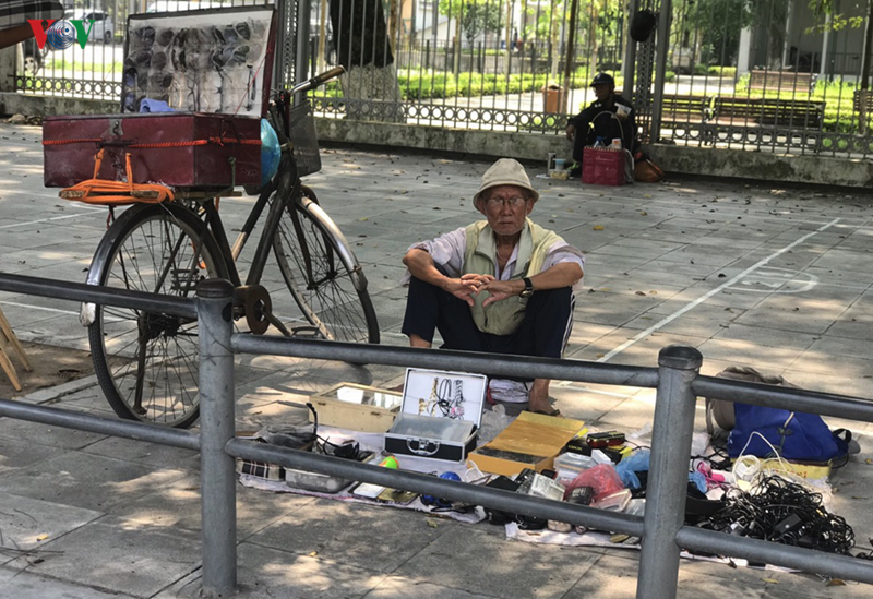 Giữa trời nắng như đổ lửa, cụ ông vẫn kiên nhẫn đợi khách ghé qua quầy hàng của mình trên đường Giải Phóng, Hà Nội.