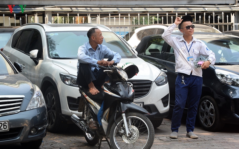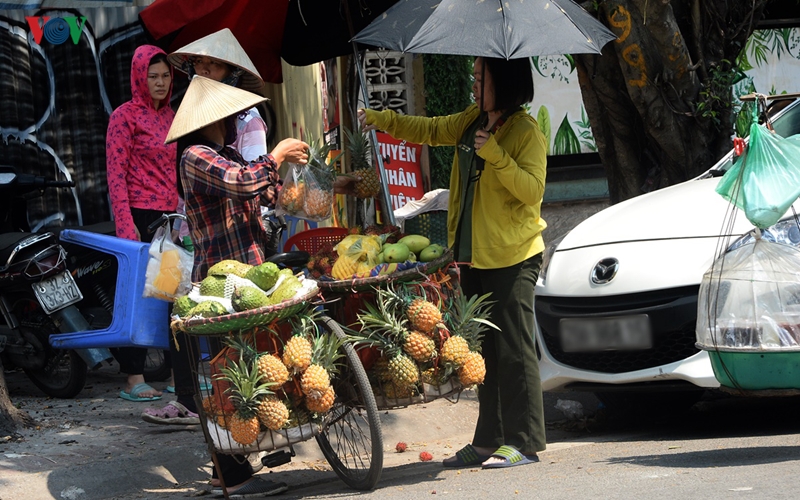 Bỏ mặc xe hàng, người bán phải đứng vào bóng râm tránh nắng nóng.