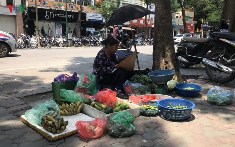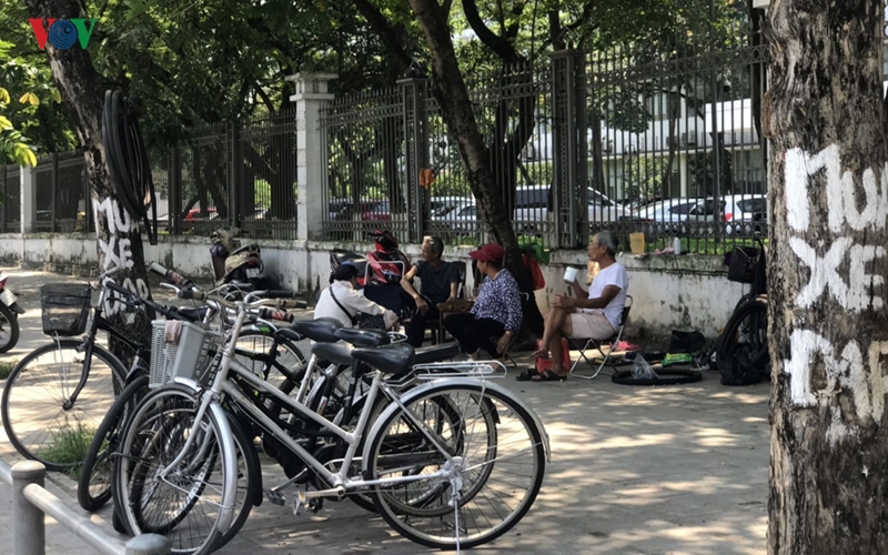 Những người buôn bán nhỏ trước cổng Đại học Bách Khoa trên đường Đại Cồ Việt trốn nắng dưới những tán cây.