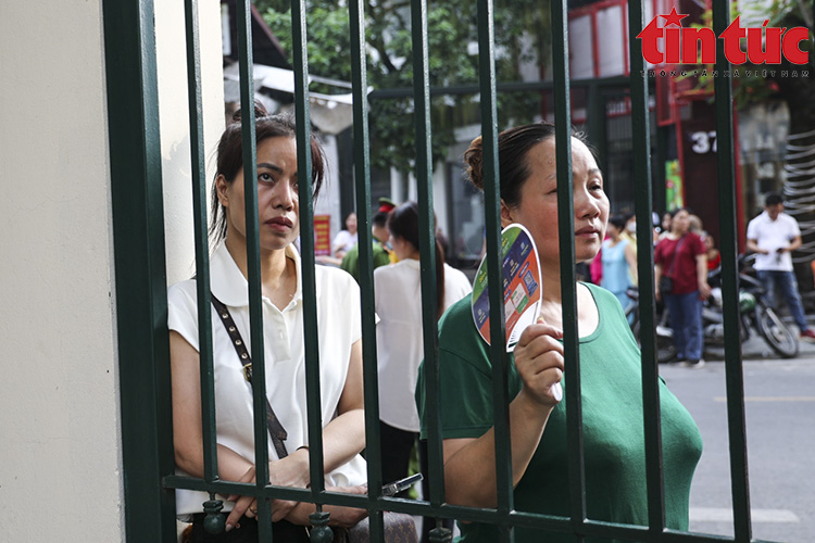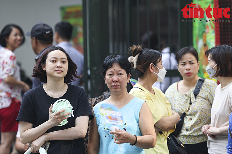 Thời tiết Hà Nội nắng nóng, oi bức, nhiều phụ huynh đứng chờ con ở các điểm thi tuyển sinh vào lớp 10.