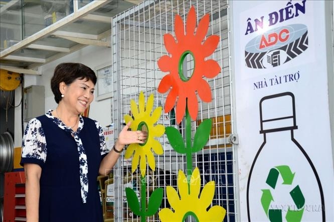 Bà Nguyễn Thị Kim Liên, Giám đốc Công ty TNHH Kinh doanh tổng hợp Ân Điển, Phó chủ tịch Hiệp hội Nữ doanh nhân thành phố Đà Nẵng với sản phẩm lồng đựng rác thải tái chế. Bà đã tặng 100 lồng cho thành phố Đà Nẵng để đặt tại các khu công cộng.
