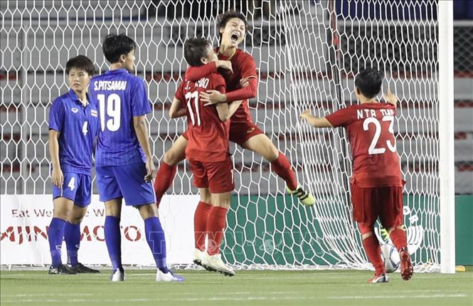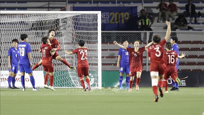 Các nữ tuyển thủ vỡ oà trong niềm vui khi Hải Yến đánh đầu tung lưới tuyển nữ Thái Lan ở hiệp phụ thứ 1.