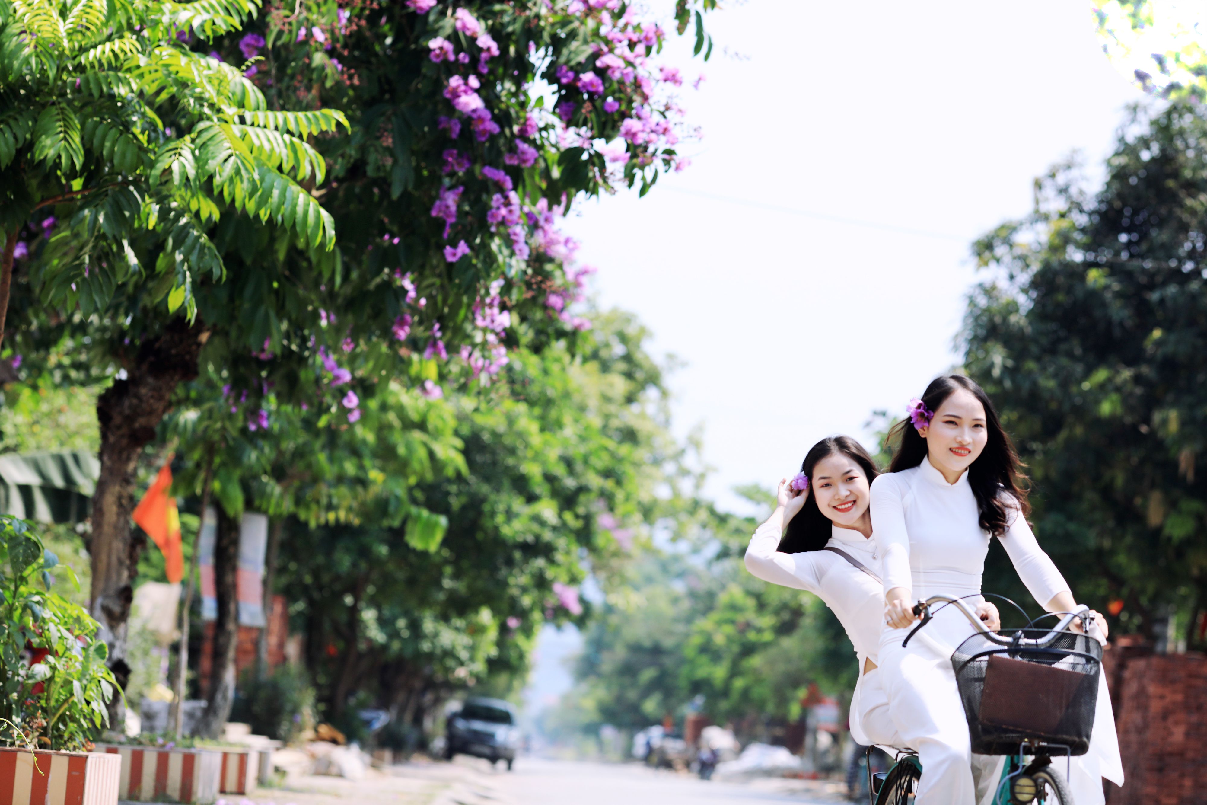 Hai thiếu nữ tạo dáng bên gốc bằng lăng