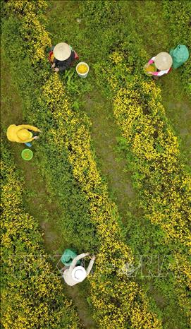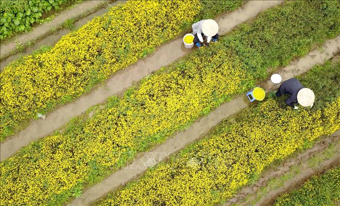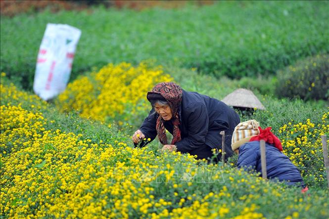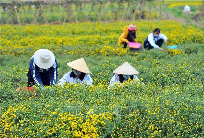 Nông dân thôn Nghĩa Trai (Văn Lâm, Hưng Yên) thu hoạch hoa cúc chi.
