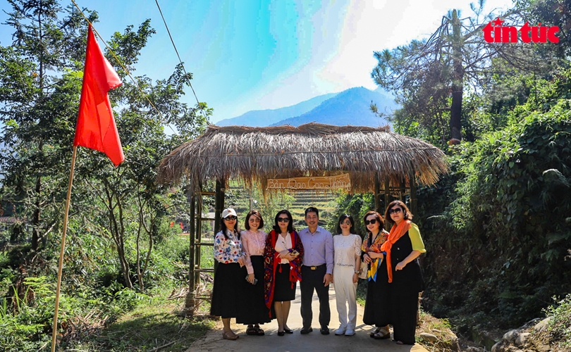 Khách du lịch háo hức trải nghiệm nhà truyền thống của người Dao Thanh Y.