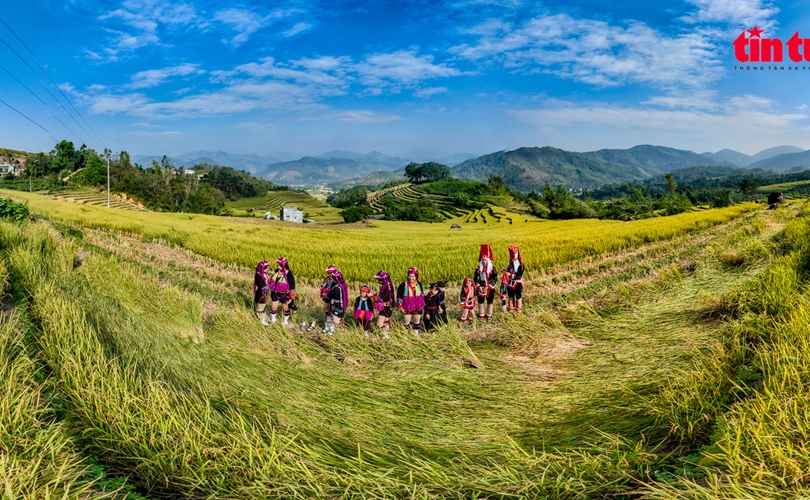 Rực rỡ sắc màu trang phục của đồng bào Dao Thanh Y trên ruộng bậc thang.