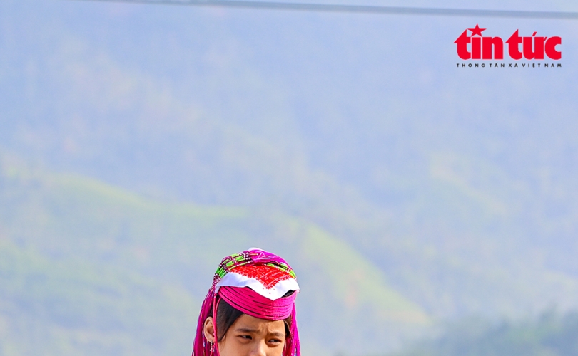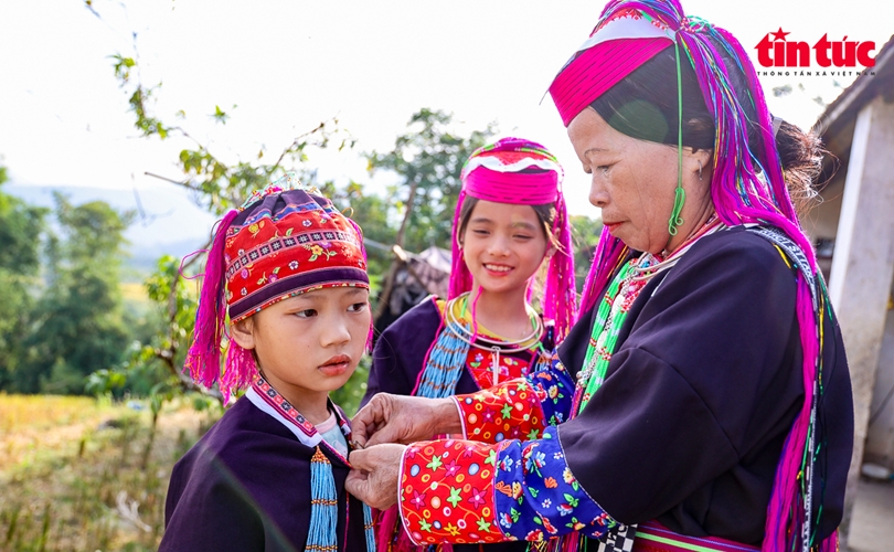 Ngay từ sớm tinh mơ, các em bé người dân tộc Dao Thanh Phán được mặc trang phục dân tộc trình diễn.