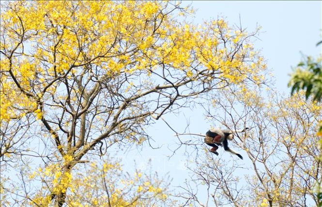 Vẻ đẹp của Voọc Chà vá chân nâu được tôn thêm giữa sắc vàng hoa Lim xẹt.