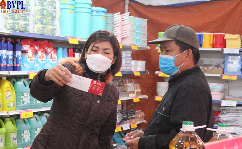 Người dân được mua hàng bằng hình thức đổi voucher lương thực, thực phẩm hoặc voucher dụng cụ gia đình có trị giá 1 triệu đồng. (Ảnh: LT)