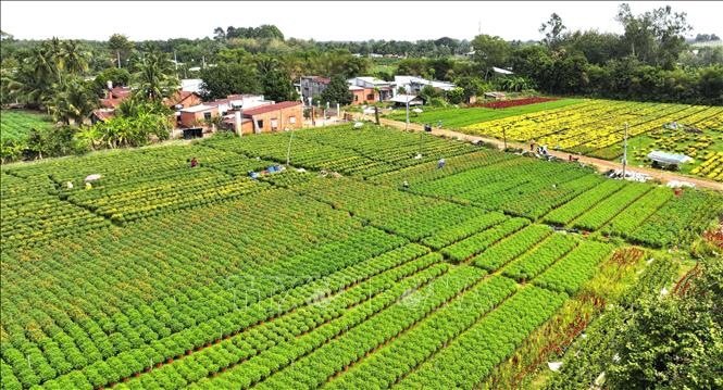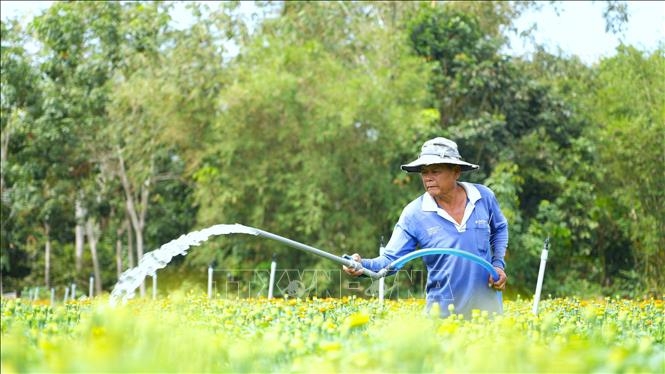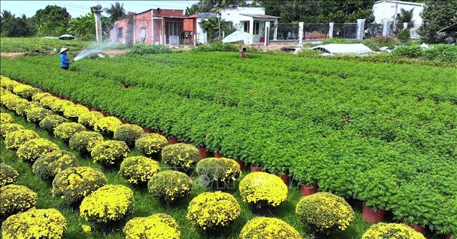 Người dân làng hoa An Cơ, huyện Châu Thành, tất bật chăm sóc hoa để kịp phục vụ cho thị trường Tết Nguyên đán Ất Tỵ 2025.