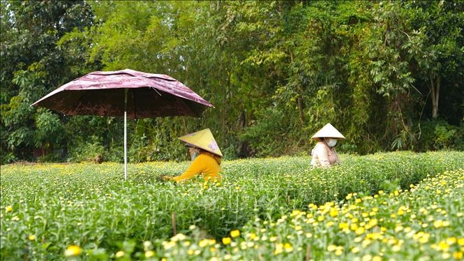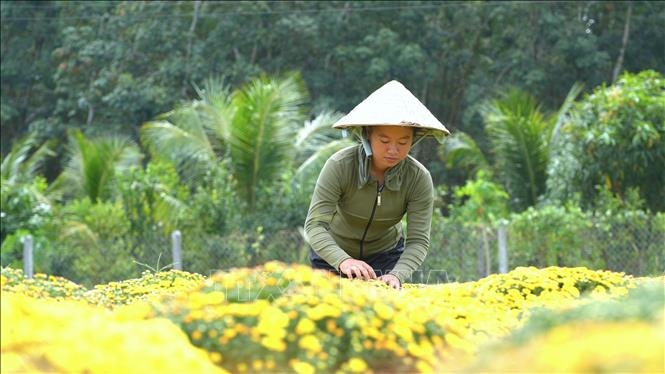 Người dân làng hoa An Cơ, huyện Châu Thành, tỉnh Tây Ninh chăm sóc những chậu hoa cúc vụ Tết.