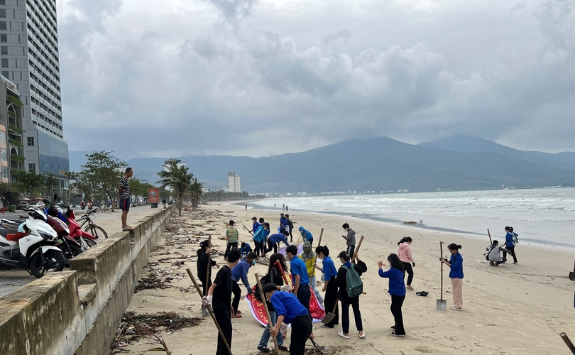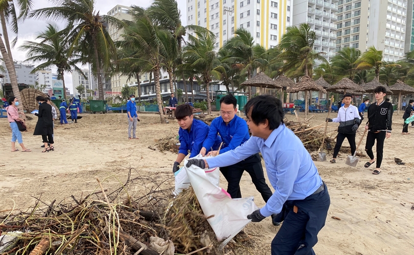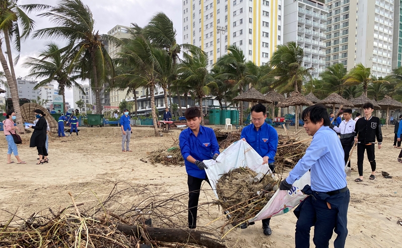 Thành đoàn Đà Nẵng đã huy động khoảng 1.300 đoàn viên thanh niên đến từ các trường ĐH, CĐ và các Quận Đoàn Sơn Trà, Ngũ Hành Sơn, Hải Châu phối hợp cùng Sở Tài nguyên và Môi trường TP Đà Nẵng ra quân dọn dẹp bờ biển. (Ảnh: TĐ)