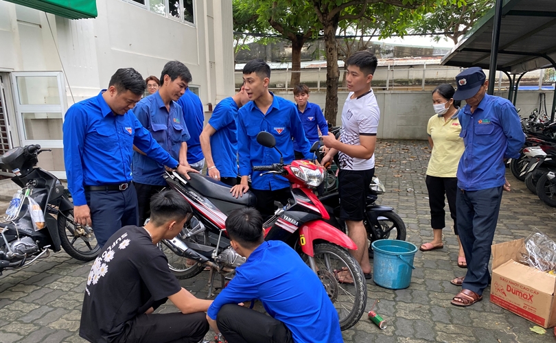 Đoàn viên, thanh niên trường Đại học Đông Á cùng với các bạn thanh niên tình nguyện khác hỗ trợ các bạn sinh viên, cũng như người dân sửa xe bị hỏng do trận ngập lịch sử. (Ảnh: TĐ)