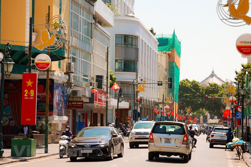 Khắp các con phố trên Thủ đô Hà Nội được trang trí rực rỡ để chào mừng 78 năm Cách mạng Tháng Tám và Quốc khánh 2/9. (Ảnh: Minh Sơn/Vietnam+)