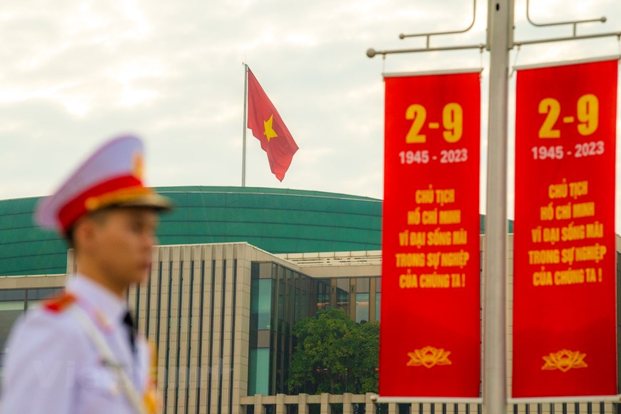 Khu vực Quảng trường Ba Đình, Lăng Chủ tịch Hồ Chí Minh, cờ hoa được treo xung quanh tạo không khí chào mừng ngày lễ lớn của dân tộc. (Ảnh: Minh Sơn/Vietnam+)